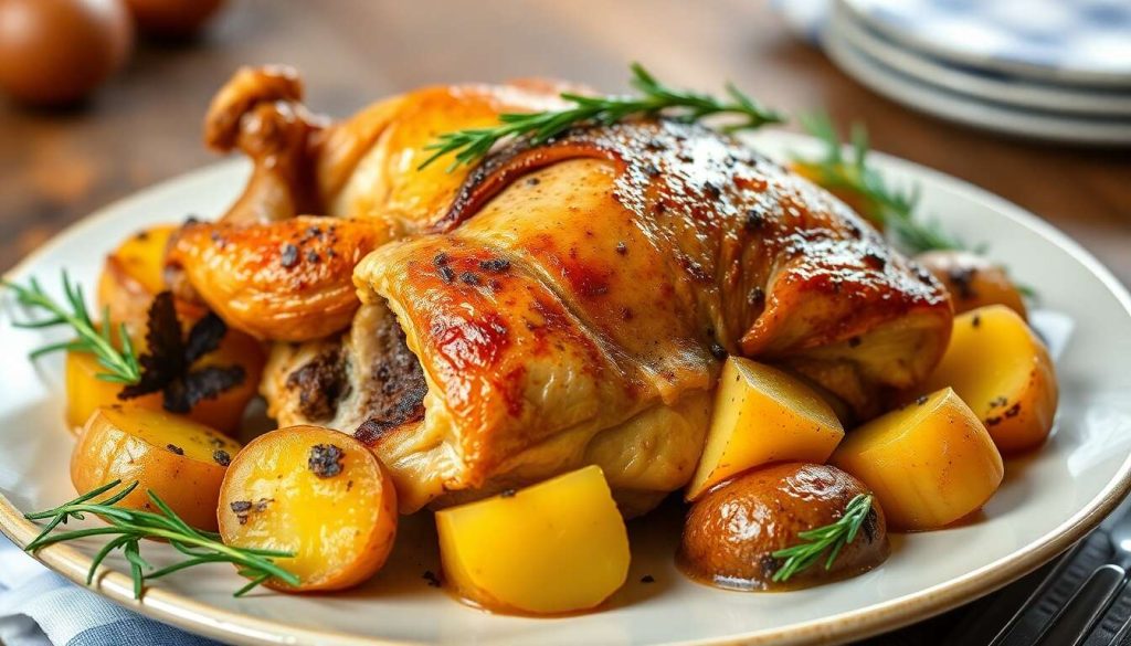 Le poulet rôti farci à la truffe et les pommes de terre fondantes sont des plats qui nous transportent directement en France. C’est un mélange de saveurs gourmandes et chaleureuses qui créeront une explosion de goûts dans votre bouche. Alors, prêt à relever le défi ? Ne vous inquiétez pas, je serai là pour vous guider à chaque étape.